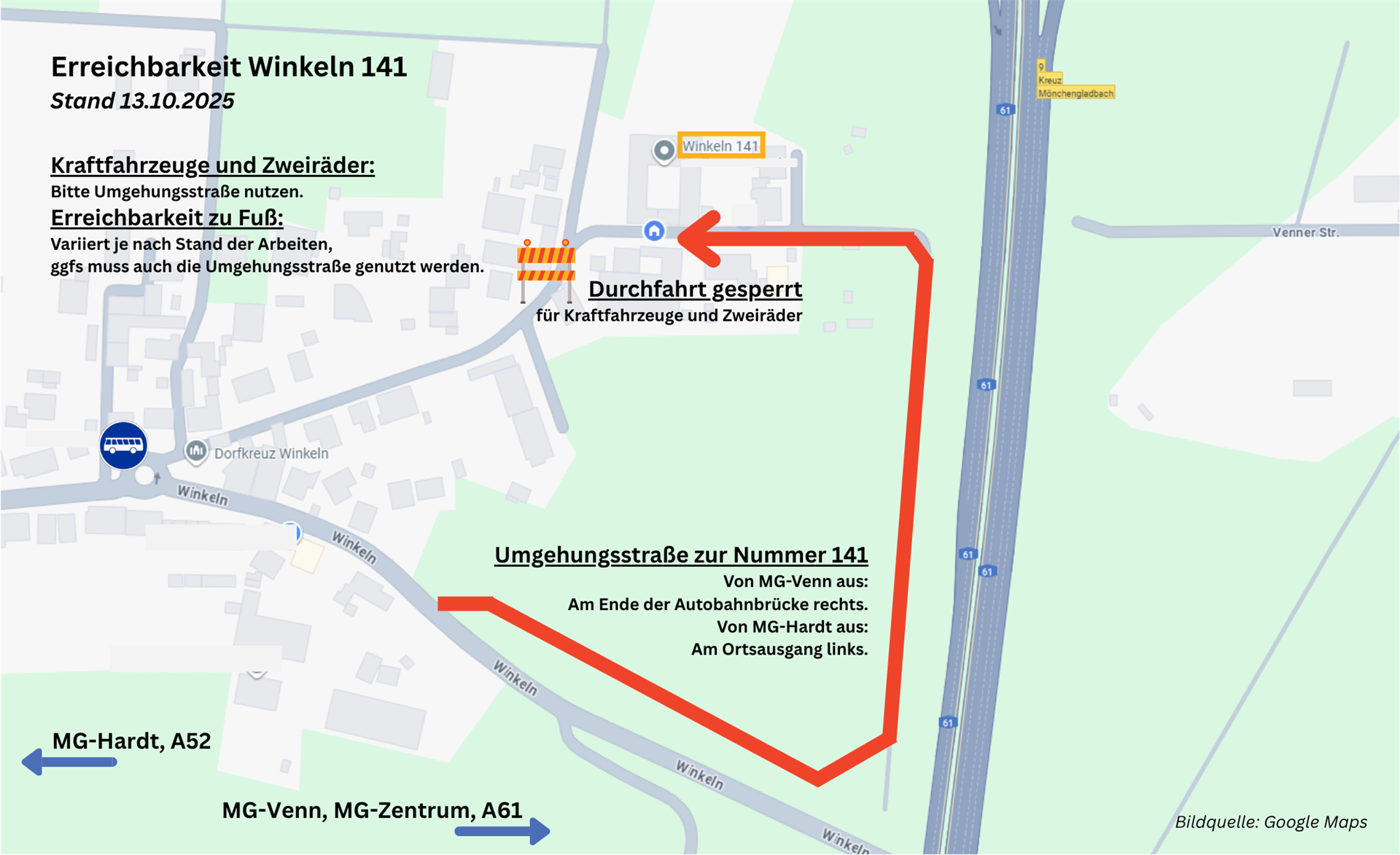 Dies bedeutet, dass unser Hof nur noch über eine provisorische Straße erreicht werden kann, welche am Ende der Brücke aus Richtung Mönchengladbach-Venn kommend rechts ins Feld abbiegt (von Mönchengladbach-Hardt aus am Ortsausgang links) und an der Autobahn entlang zu unserer Straße führt, die damit gewissermaßen "von der anderen Seite aus" erreicht wird. Mit dem Bus wird Winkeln erreichbar bleiben, die Haltestelle wird aber im weiteren Verlauf der Arbeiten am Ortseingang (von Venn aus gesehen) neu installiert. Inwieweit wir auf dem bisherigen Wege zu Fuß erreichbar sind, gestaltet sich täglich wechselnd und ist immer vom aktuellen Stand der Arbeiten abhängig.
