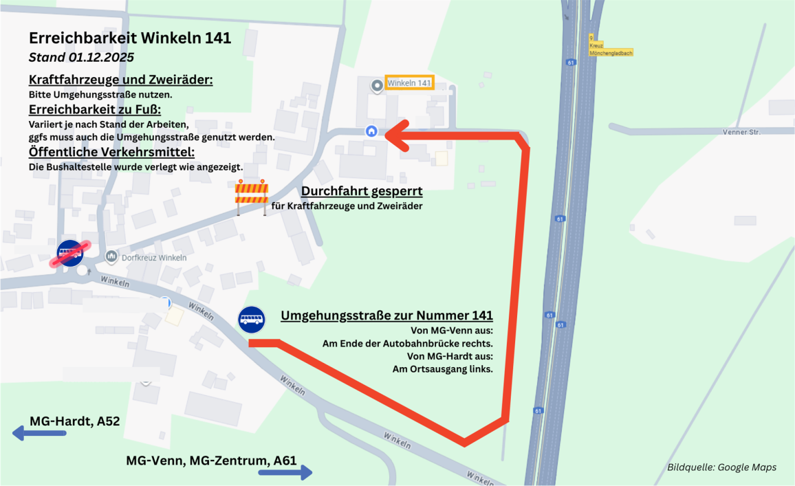 Dies bedeutet, dass unser Hof nur noch über eine provisorische Straße erreicht werden kann, welche am Ende der Brücke aus Richtung Mönchengladbach-Venn kommend rechts ins Feld abbiegt (von Mönchengladbach-Hardt aus am Ortsausgang links) und an der Autobahn entlang zu unserer Straße führt, die damit gewissermaßen "von der anderen Seite aus" erreicht wird. Die Bushaltestelle wurde vom Kreisverkehr an den Ortseingang (von Venn aus kommend) verlegt. Inwieweit wir auf dem bisherigen Wege zu Fuß erreichbar sind, gestaltet sich täglich wechselnd und ist immer vom aktuellen Stand der Arbeiten abhängig.