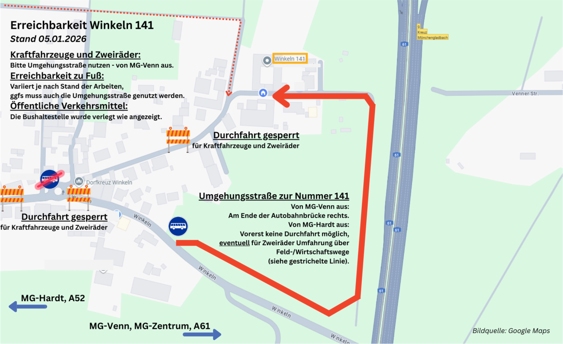 Dies bedeutet, dass unser Hof nur noch über eine provisorische Straße erreicht werden kann, welche am Ende der Brücke aus Richtung Mönchengladbach-Venn kommend rechts ins Feld abbiegt und an der Autobahn entlang zu unserer Straße führt, die damit gewissermaßen "von der anderen Seite aus" erreicht wird. Die Bushaltestelle wurde vom Kreisverkehr an den Ortseingang (von Venn aus kommend) verlegt. Inwieweit wir auf dem bisherigen Wege zu Fuß erreichbar sind, gestaltet sich täglich wechselnd und ist immer vom aktuellen Stand der Arbeiten abhängig.